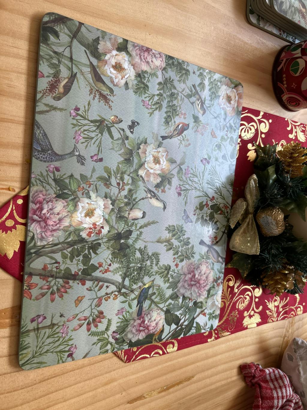 Chinoiserie placemats in a set of four, depict ornate flora and fauna upon a wash of soft green. Our beautiful placemats are a stylish addition to your table setting. Cork backed and with a lacquer finish.